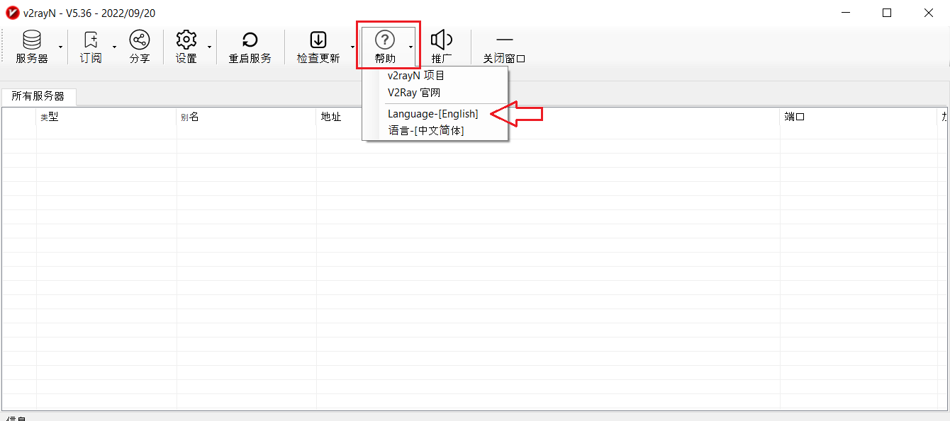 3) زبان پیشفرض V2RayN چینی است. برای تغییر زبان ابتدا روی علامت سوال کلیک کرده و Language : English را انتخاب کنید.