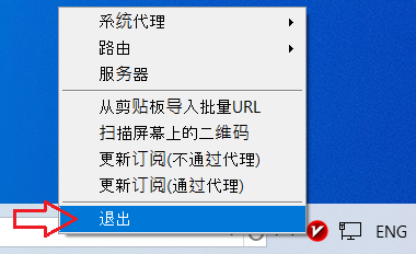 4) برای اعمال این تغییر لازم است تا یکبار برنامه را به صورت کامل بسته و مجددا باز کنید. برای انجام این کار مطابق تصویر روی آیکن V2rayN در نوار پایین صفحه راست کلیک کرده و گزینه آخر را انتخاب کنید.