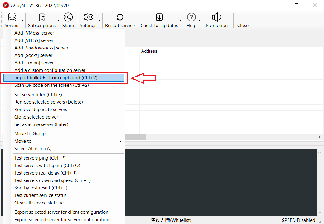 5) حال با باز کردن مجدد برنامه میبینید که زبان به انگلیسی تغییر یافته. در ابتدا صفحه مربوط به Connection های برنامه خالی است. برای ایجاد کانکشن ابتدا بایستی آدرس اتصال سروری که در بخش اطلاعات سرویس خود میبینید را کپی کنید. سپس همانند تصویر روی Servers کلیک کرده و از پنجره باز شده گزینه Import bulk URL from clipboard را انتخاب کنید.