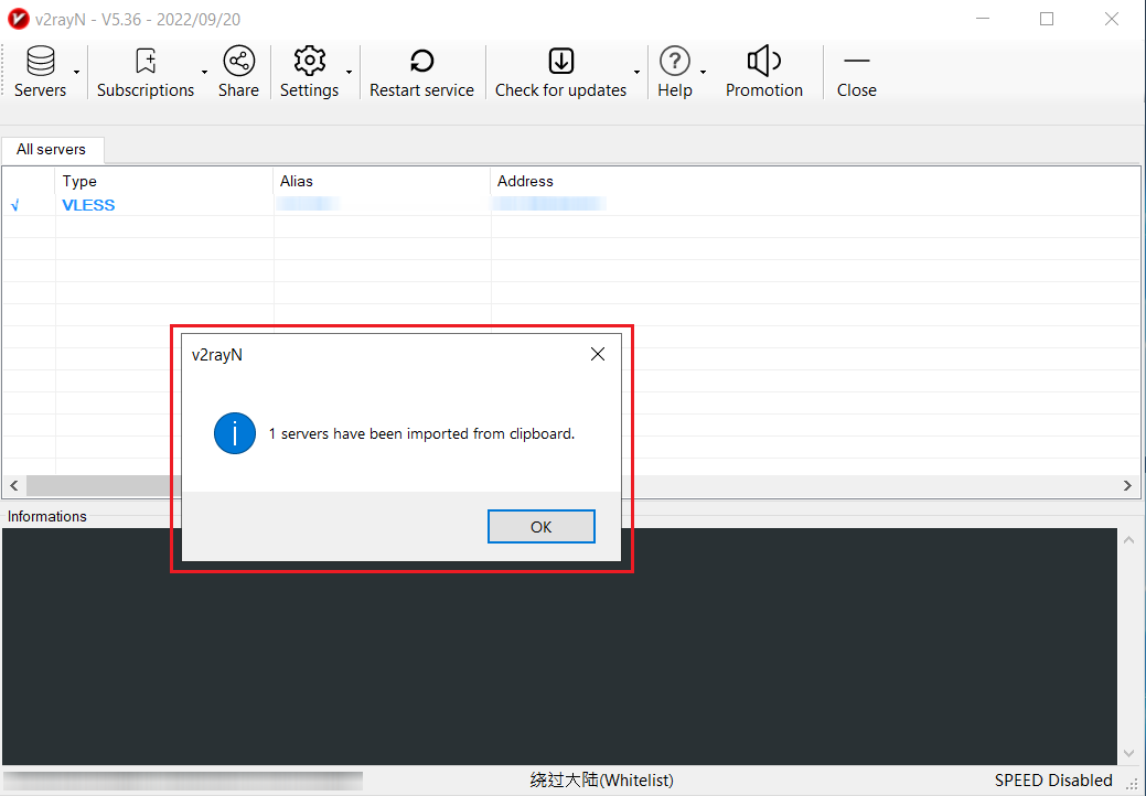 6) مطابق تصویر پیغامی مبنی بر درج موفقیت آمیز کانکشن در V2rayN به شما نمایش داده میشود.روی دکمه OK کلیک کنید.