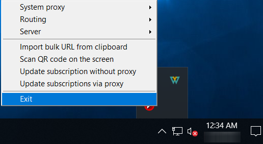 برای قطع کانکشن و اتصال به اینترنت عادی بایستی نرم افزار V2rayN را به صورت کلی ببندید. برای این کار از نوار پایین صفحه روی آیکن V2rayN مطابق تصویر راست کلیک کرده و گزینه Exit را انتخاب کنید.