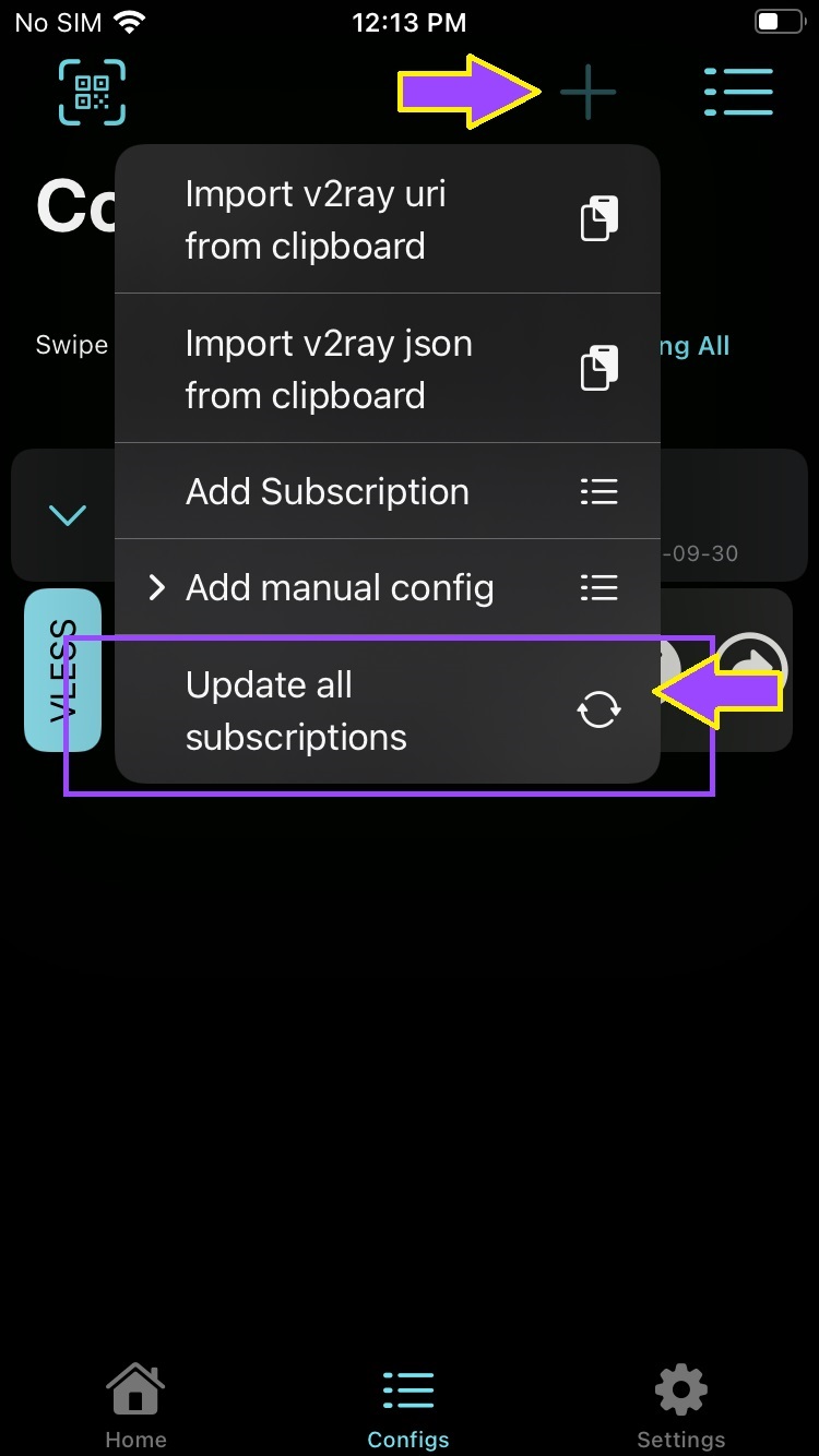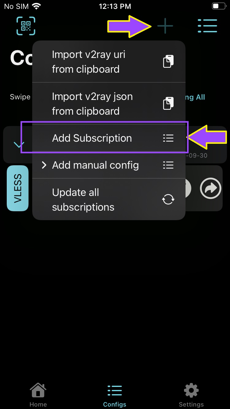 پس از ورود به تب Configs از بالا سمت راست علامت بعلاوه + را زده و در منوی باز شده گزینه Add Subscription را مطابق تصویر بالا انتخاب می کنیم.