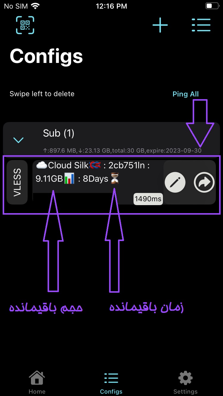 مانند تصویر بالا به تب Configs میرویم و از دکمه بعلاوه+ و منوی باز شده گزینه Update all Subscription را کلیک می کنیم و منتظر میمانیم سرویس بروزرسانی شود، در این حالت لینک سرویس و آخرین حجم و زمان سرویس شما بروزرسانی می شود و مانند تصویر زیر قابل مشاهده است: