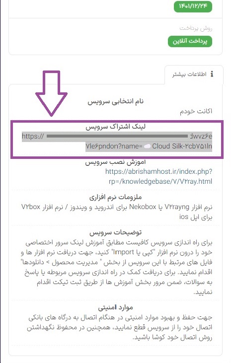 از سایت ابریشم هاست وارد بخش ناحیه کاربری می شویم، سپس از بخش سرویس ها سرویس خریداری شده را انتخاب می کنیم و به پایین صفحه میرویم تا اطلاعات سرویس را مشاهده کنیم، حال مطابق تصویر بالا لینک اشتراک سرویس (کل لینک در کادر بنفش) را بطور کامل انتخاب کرده و کپی می کنیم.
