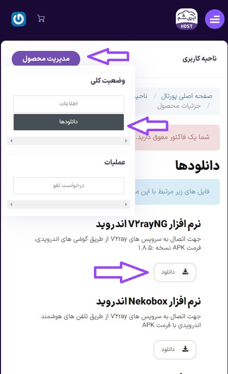 سپس طبق تصویر بالا ، از منوی مدیریت محصول > دانلودها را انتخاب نمایید، در صفحه دانلودها آخرین فایل APK نرم افزار را دانلود و بر روی گوشی نصب نمایید.