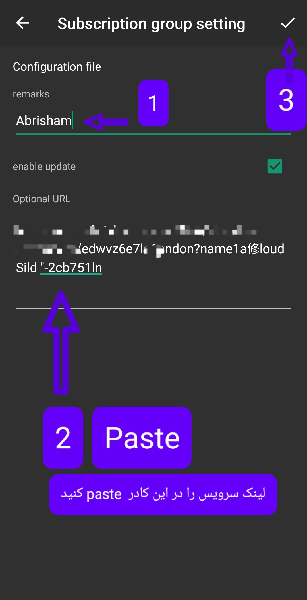 در صفحه ی باز شده در کادر remarks عبارت Abrisham را می نویسیم ، در کادر Optional URL لینک سرویسی را که در مراحل قبل کپی کردیم Paste(الصاق) می کنیم. و در نهایت تیک بالای صفحه را به نشانه تایید و ذخیره کلیک می کنیم.(در تصویر بالا مراحل به ترتیب از عدد 1 تا 3)