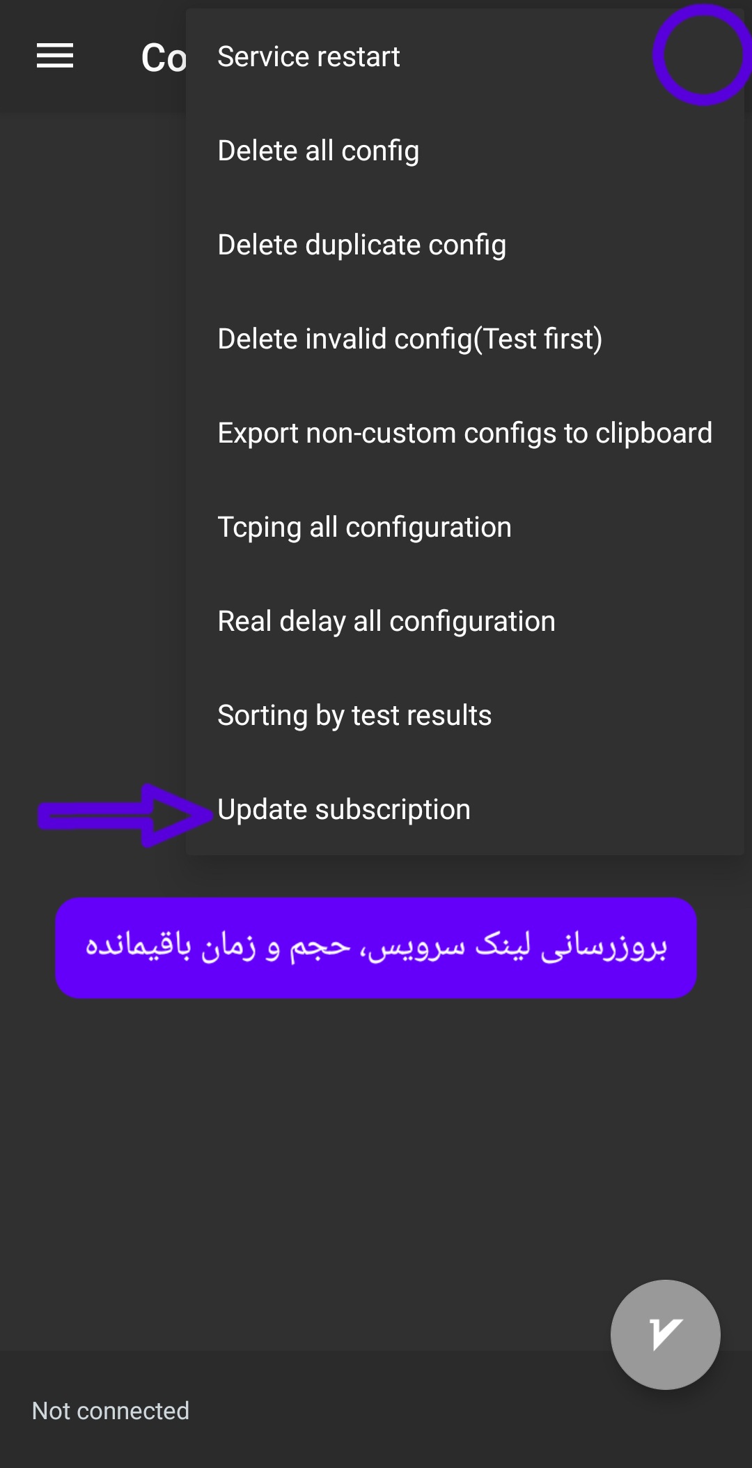 در این مرحله و با ورود به صفحه اصلی نرم افزار ، 3نقطه بالا سمت راست (با دایره مشخص شده) را کلیک می کنیم تا منوی فرعی نرم افزار باز شود، در این منو عبارت Update subscription را کلیک می کنیم. با اینکار لینک سرویس شما به همراه حجم و زمان باقیمانده بروزرسانی می شود.